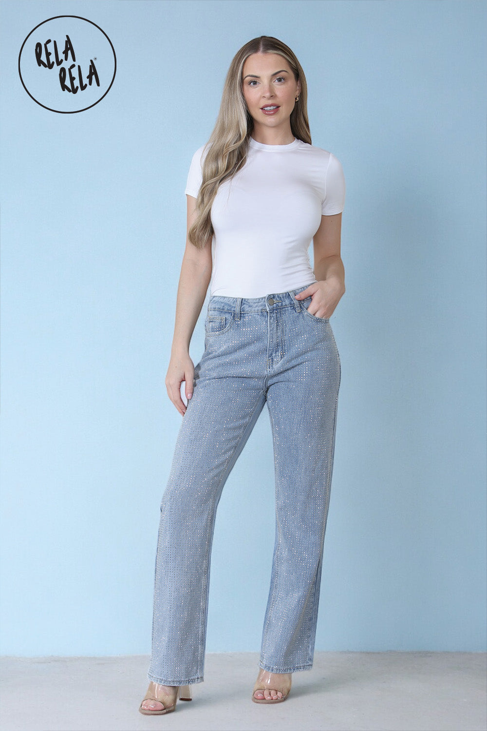 Add a touch of sparkle to your wardrobe with these Classic High-Waist Rhinestone Detailed Straight Leg Jeans in Denim Blue. Perfect for any occasion, these jeans blend timeless style with a hint of glamour. The high-waist design provides a flattering fit and elongates the legs, while the straight leg cut offers a classic and comfortable silhouette. The subtle rhinestone detailing adds a hint of sparkle, elevating your look and making these jeans a versatile addition to your wardrobe.
