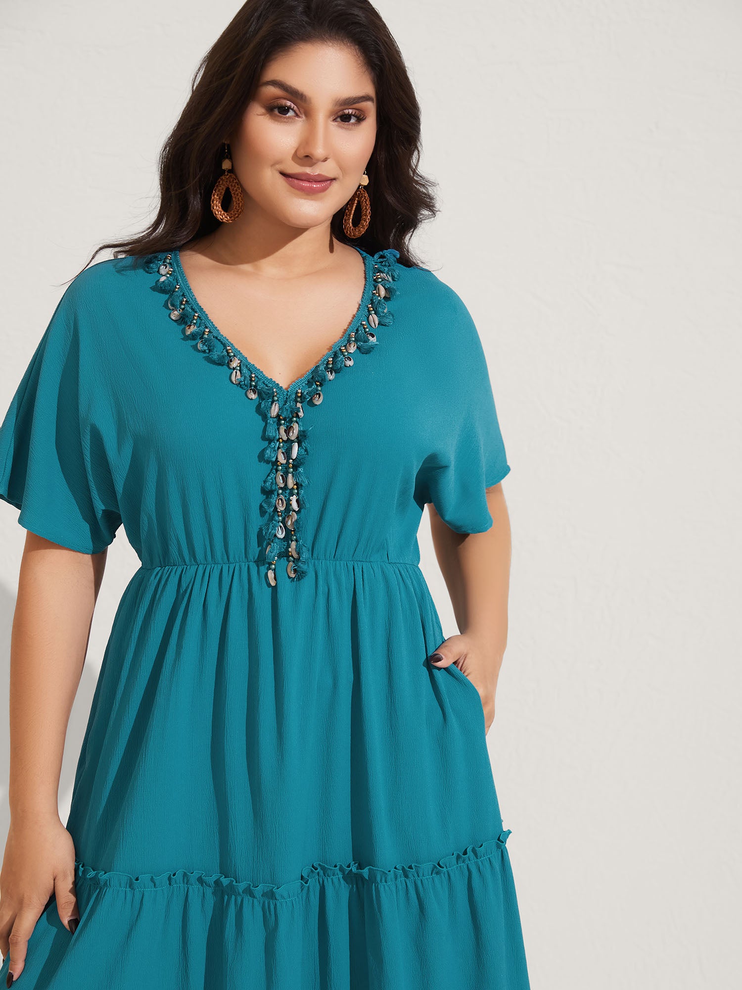 Collar Seashells Tassels Tiered Maxi Dress