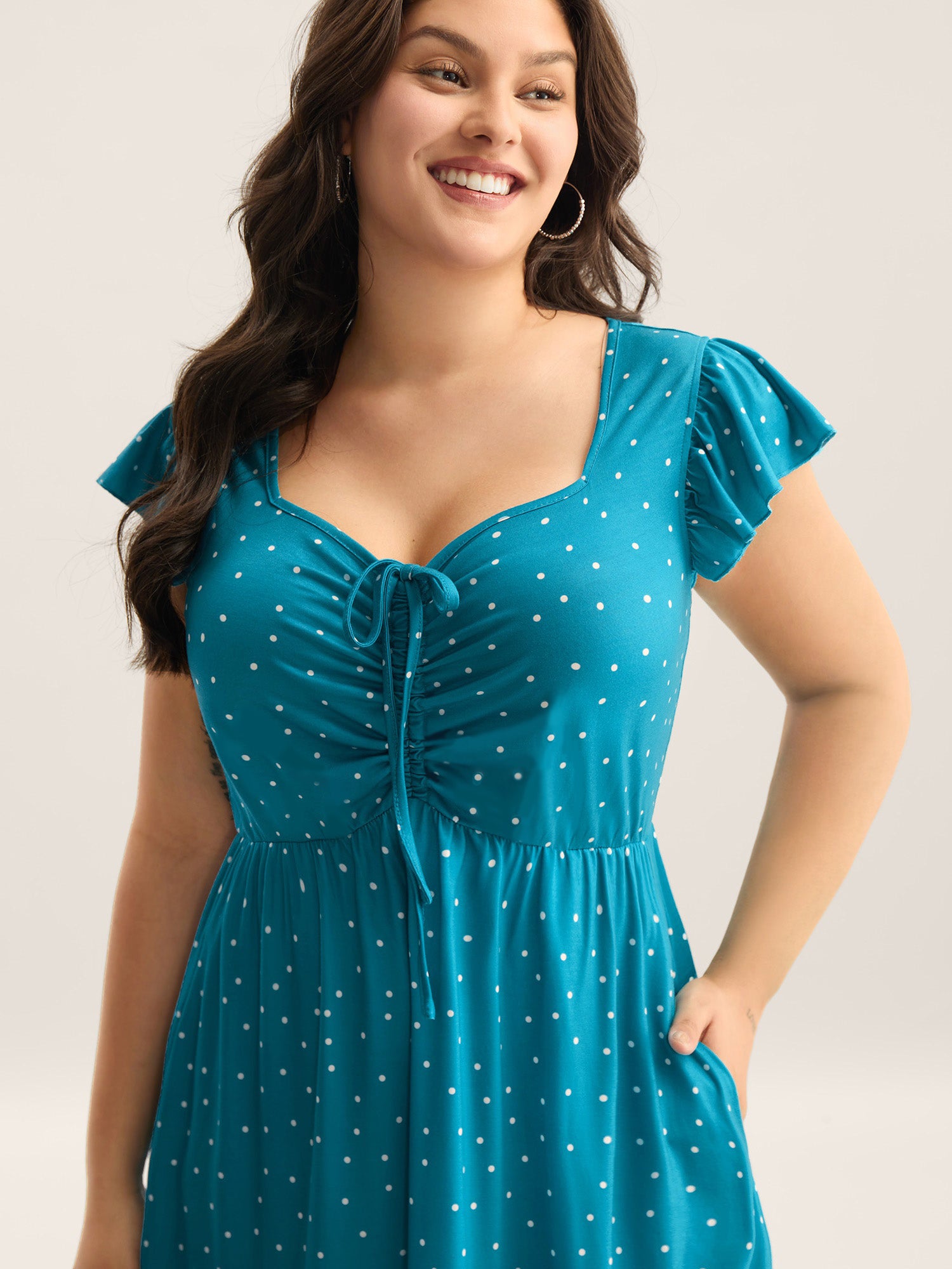 Dot Print Ruched Drawstring Midi Dress