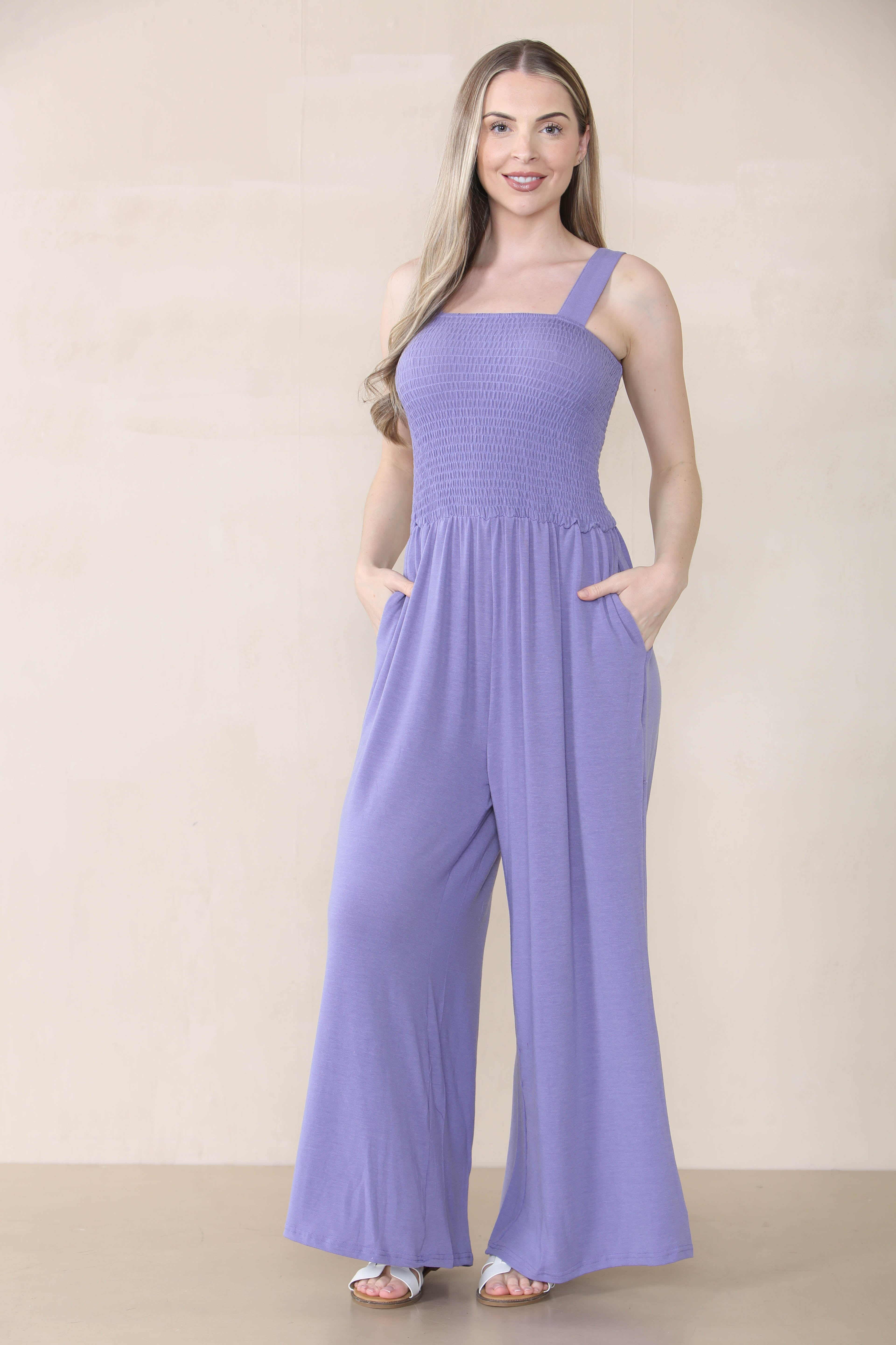 Elegant Thick Strap Ruched Pocket Wide Leg Jumpsuit