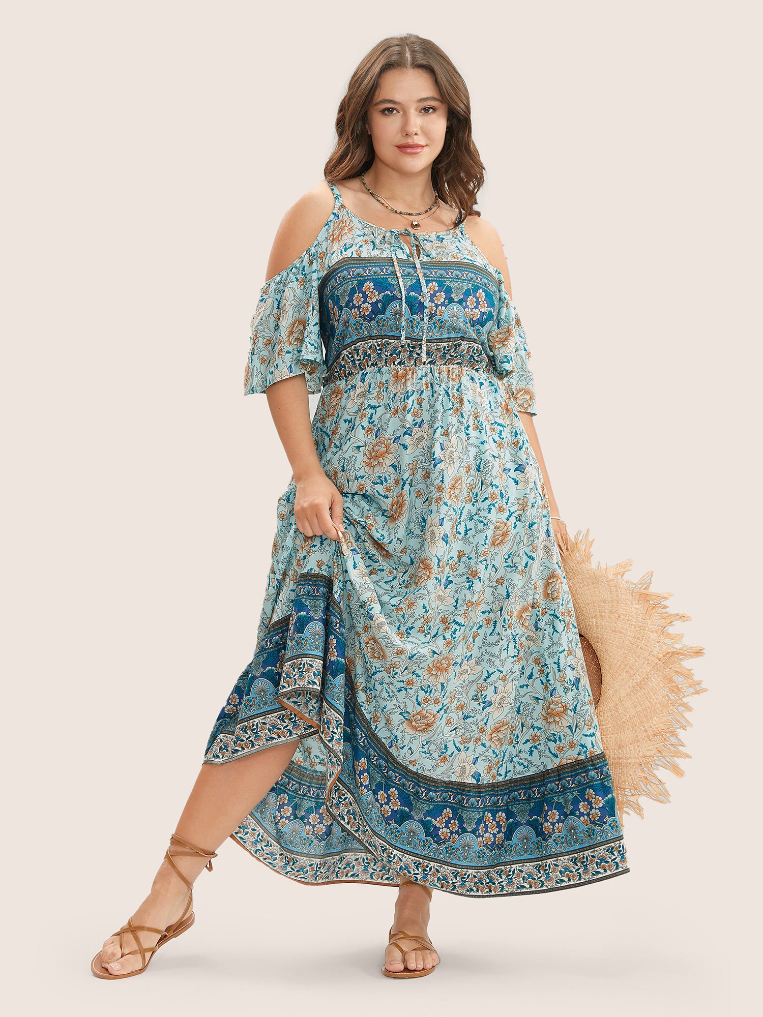 Floral Print Pocket Keyhole Ruffles Cold Shoulder Maxi Dress