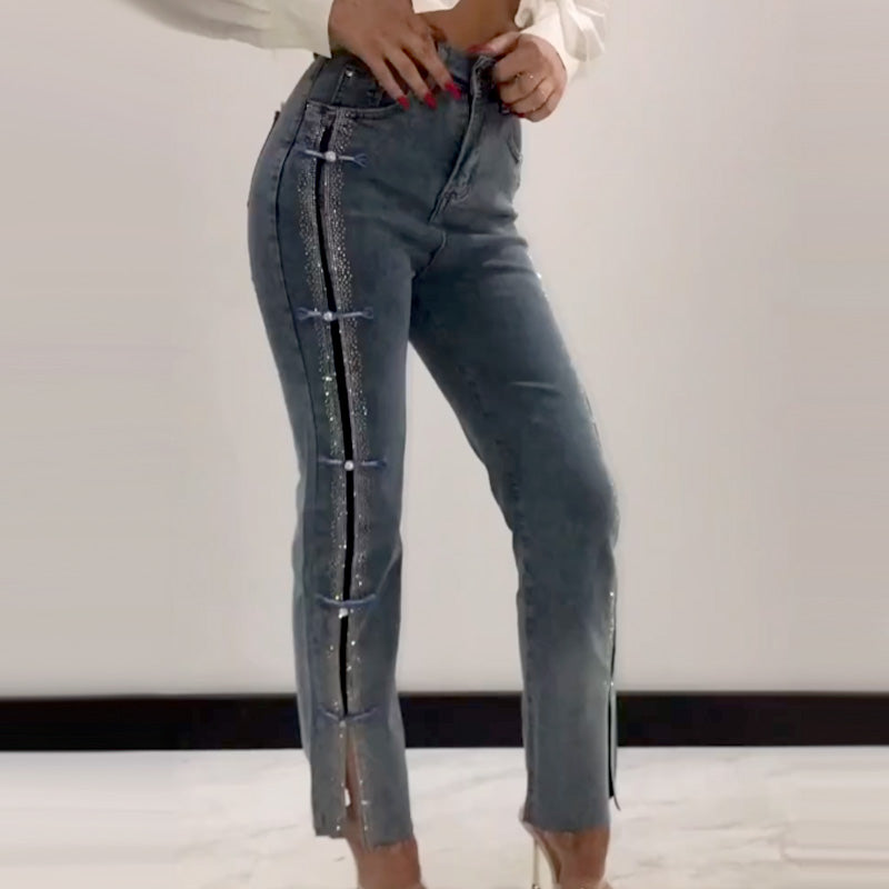 GLAMOUROUS STRASS DECORATIONS:These jeans embellished with shimmering rhinestones sparkle in any light and make you stand out from the crowd.