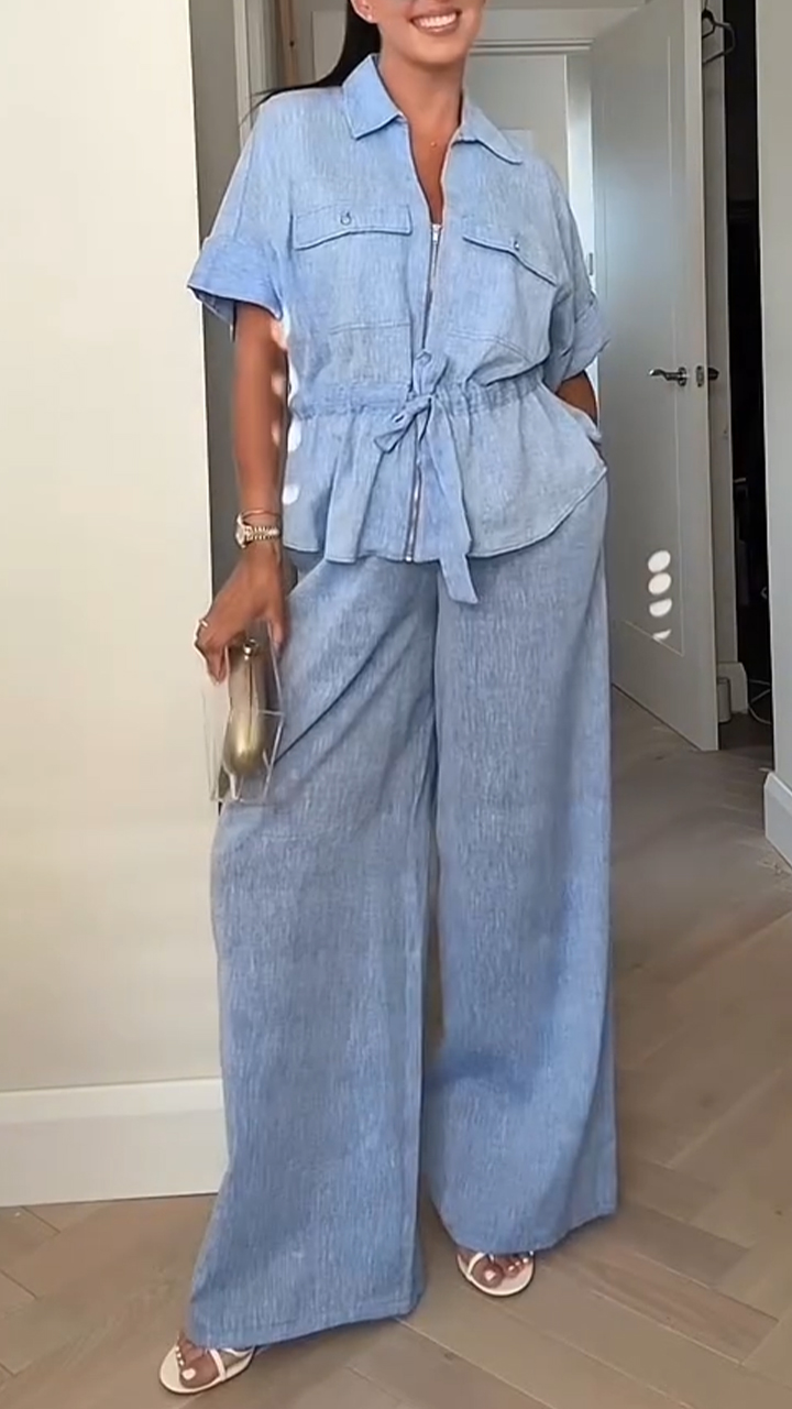 Ladies' Collar and Waist Cinched Top+pants Casual Suit
