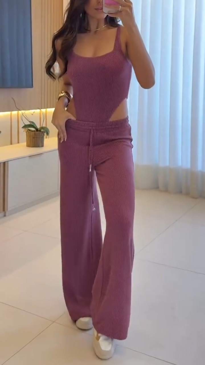 Ladies' Loose Neck Hollowed Out Tight Fitting Top+pants Casual Suit