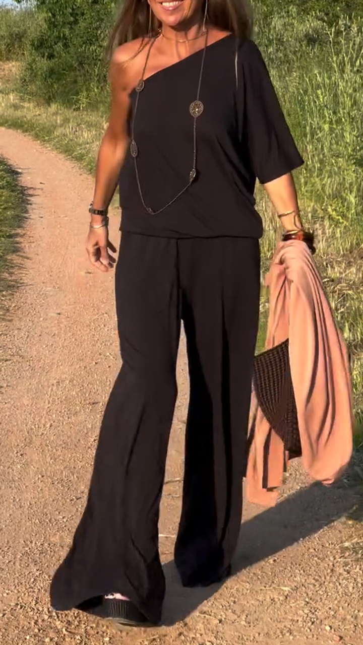 Ladies' Oblique Neck Solid Color Loose Casual Suit