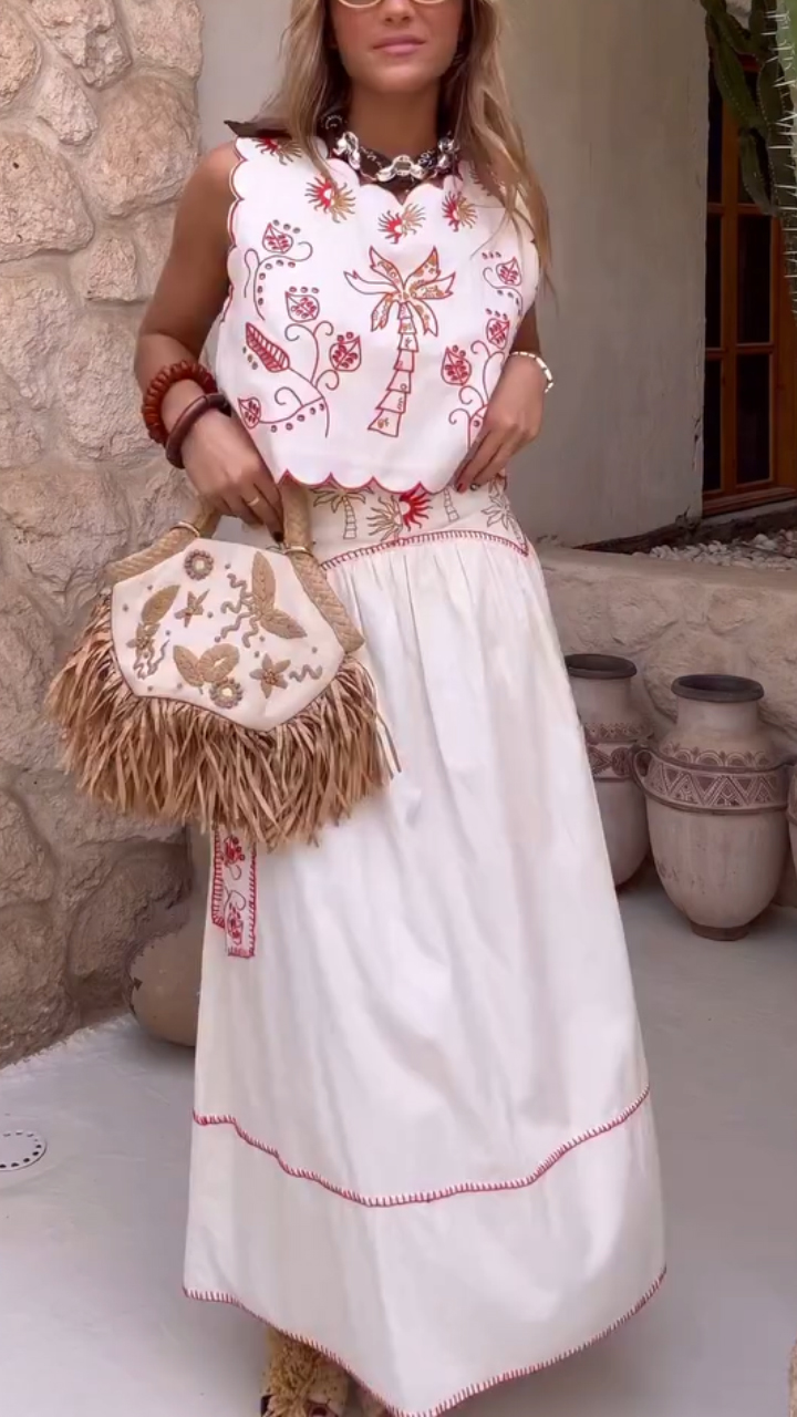 Ladies' Round Neck Double-sided Printed Top+skirt Casual Set