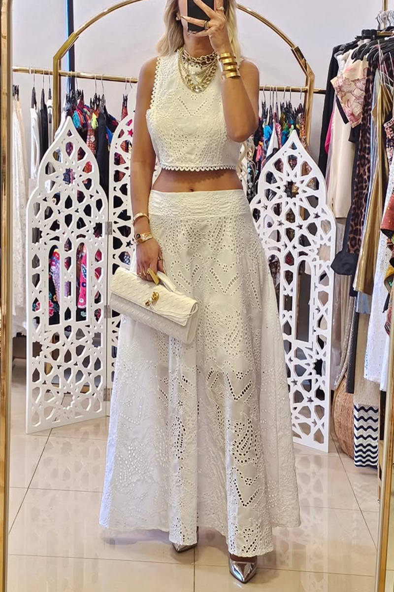 Ladies' Round Neck Printed Hollow Top+skirt Casual Set