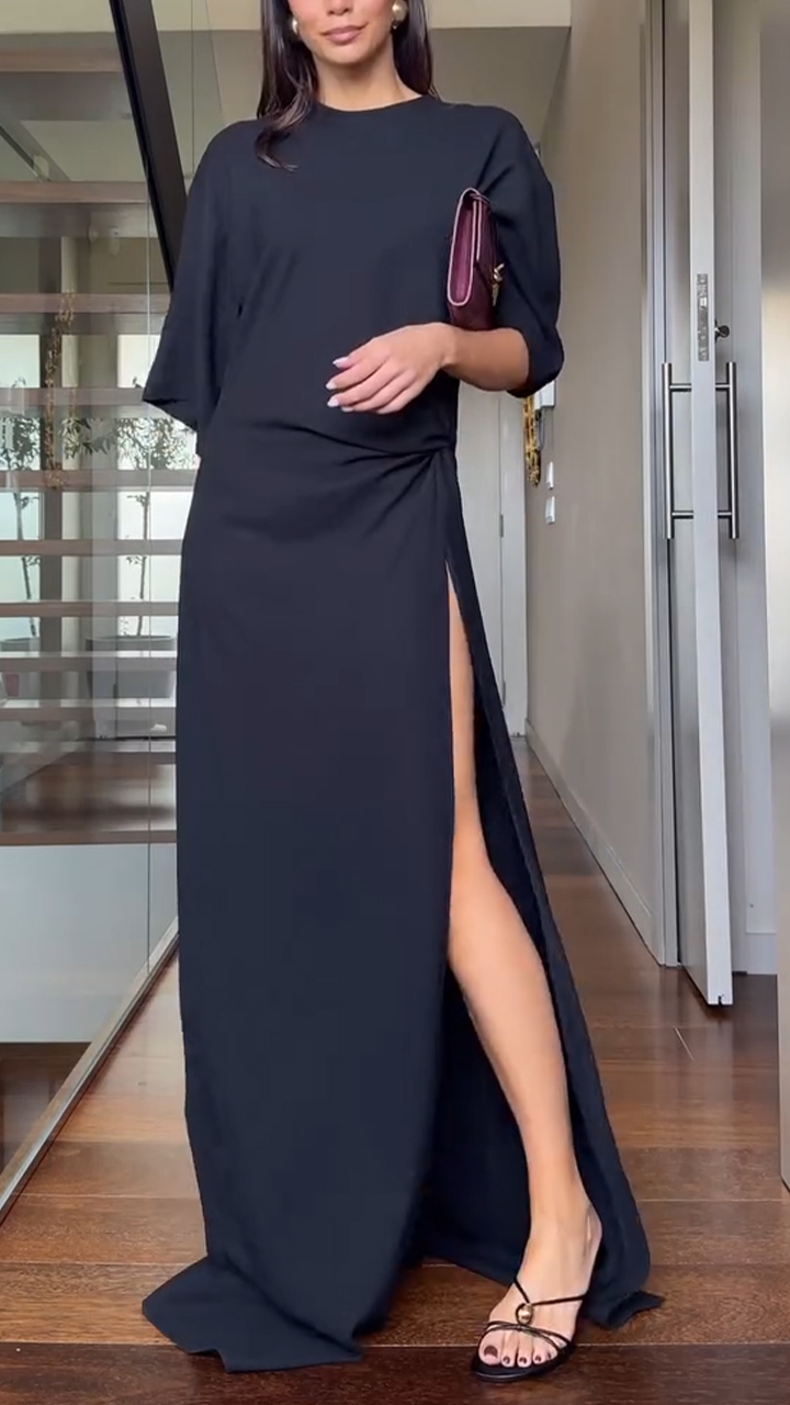 Ladies' Round Neck Solid Color Slit Temperament High-end Dress