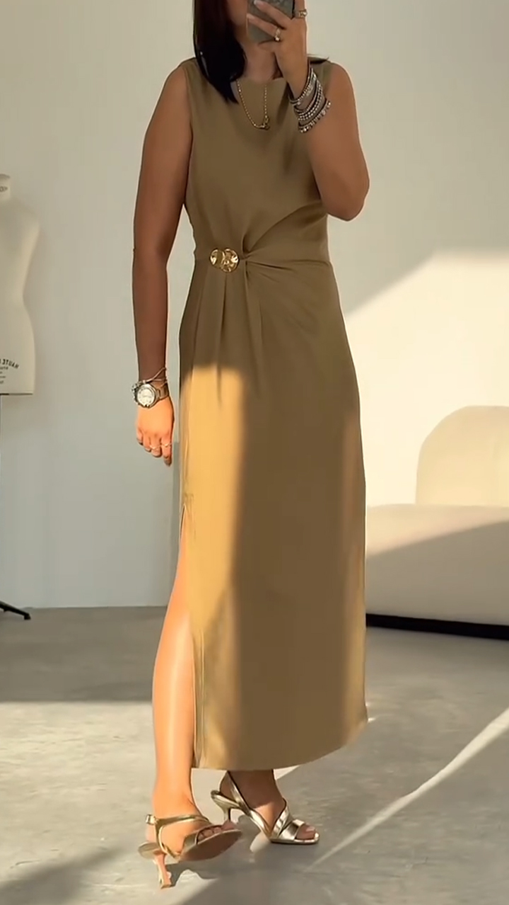 Ladies' Round Neck Waist Pleated Slit Temperament Dress