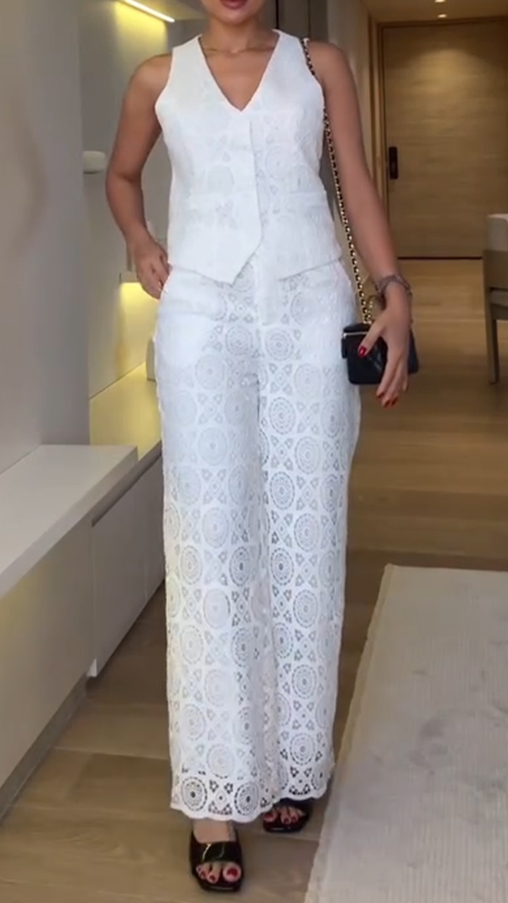 Ladies' V-neck Top+printed Hollow Lace Pants Casual Temperament Set