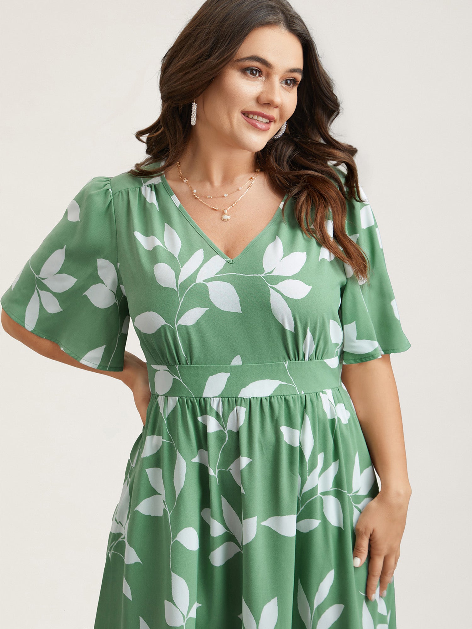 Leaf Print Waist-Cinched Flared Maxi Dress