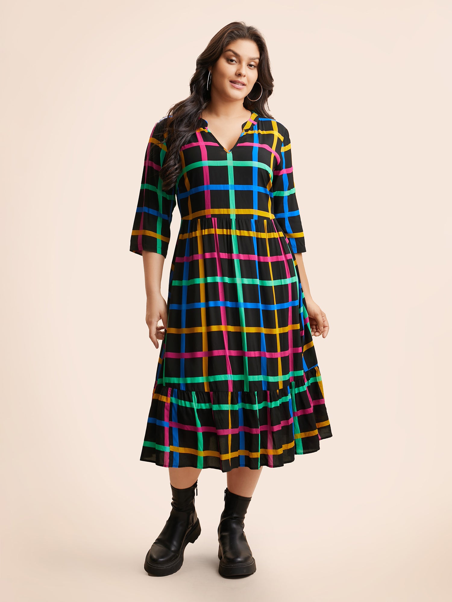 Plaid Notched Ruffle Hem Pocket Dress