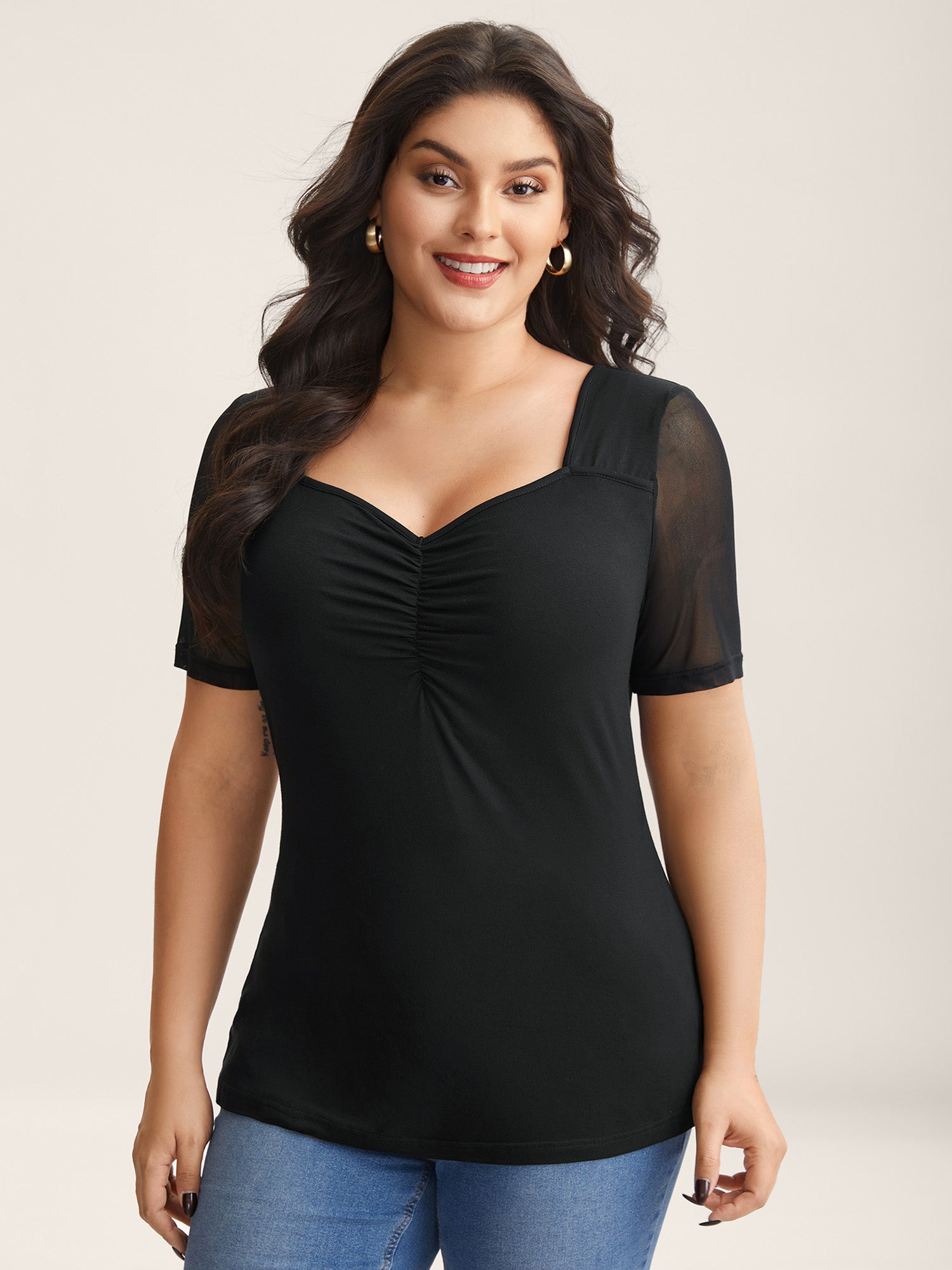 Sheer Sleeve Fitted Sweetheart Plain Top