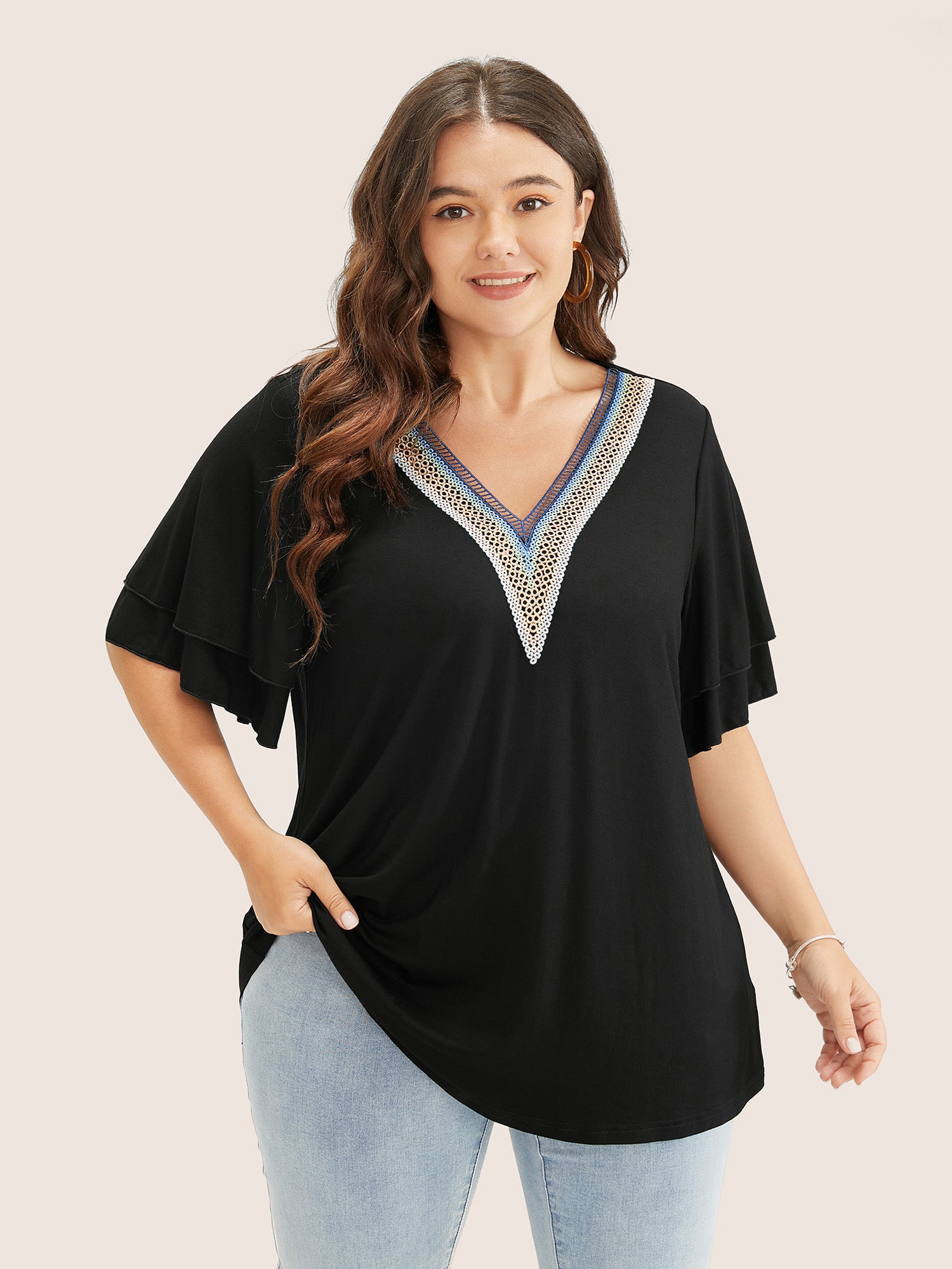 Solid Crochet Lace Ruffle Tiered Sleeve V Neck T-shirt