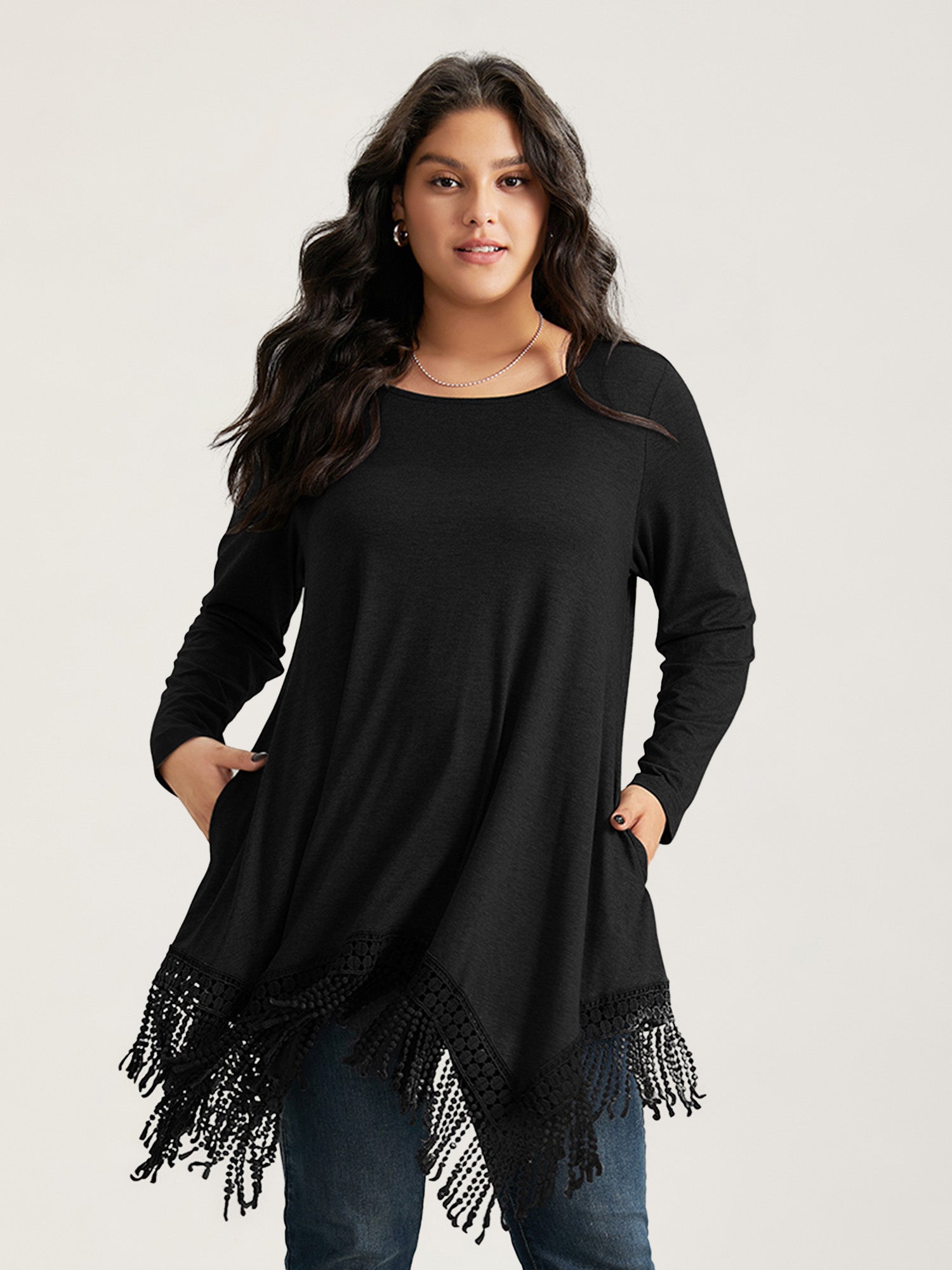 Solid Tassels Trim Pocket Asymmetrical Hem T-shirt