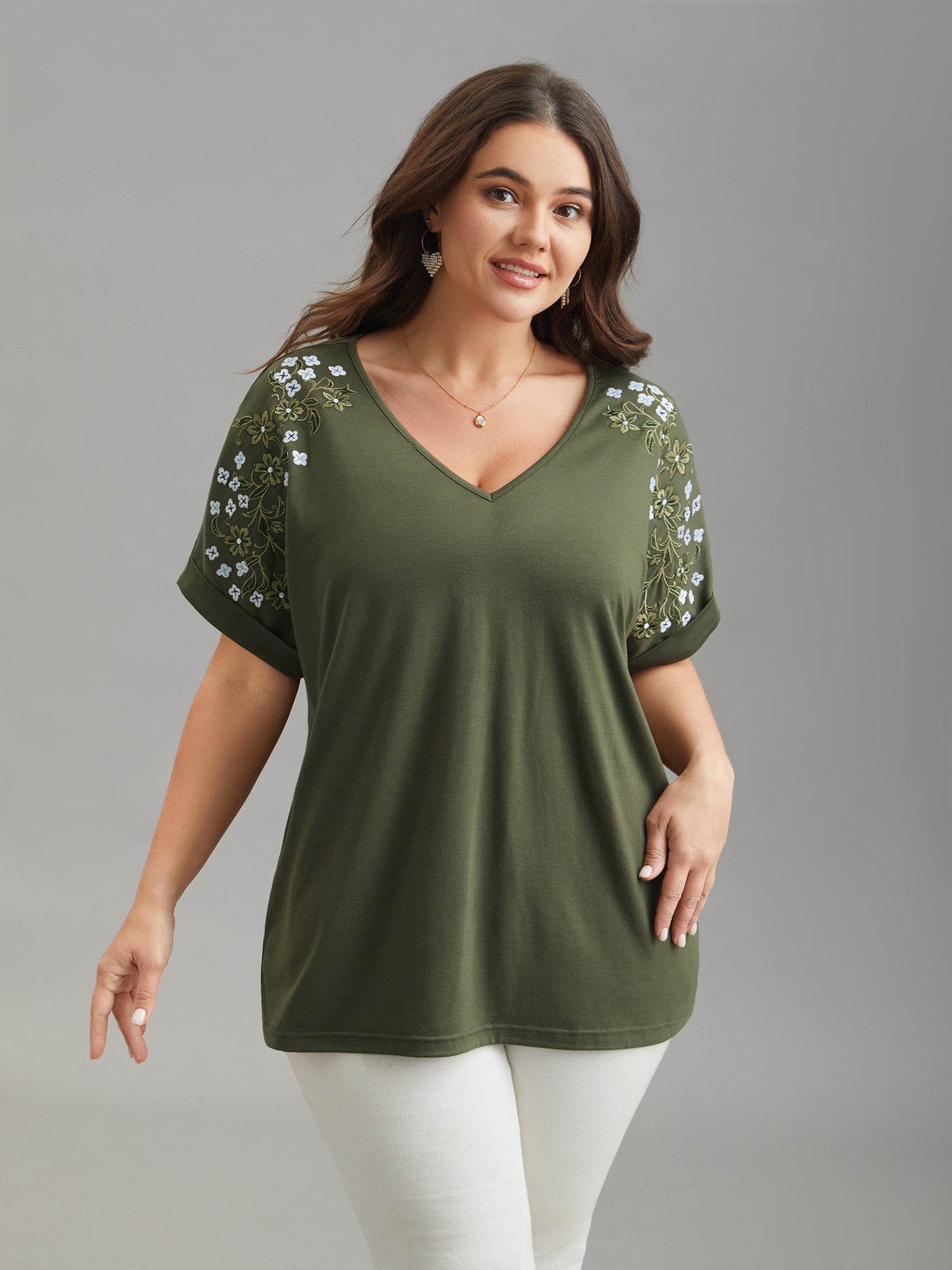 Stretchy Embroidered Drop Shoulder T-Shirt