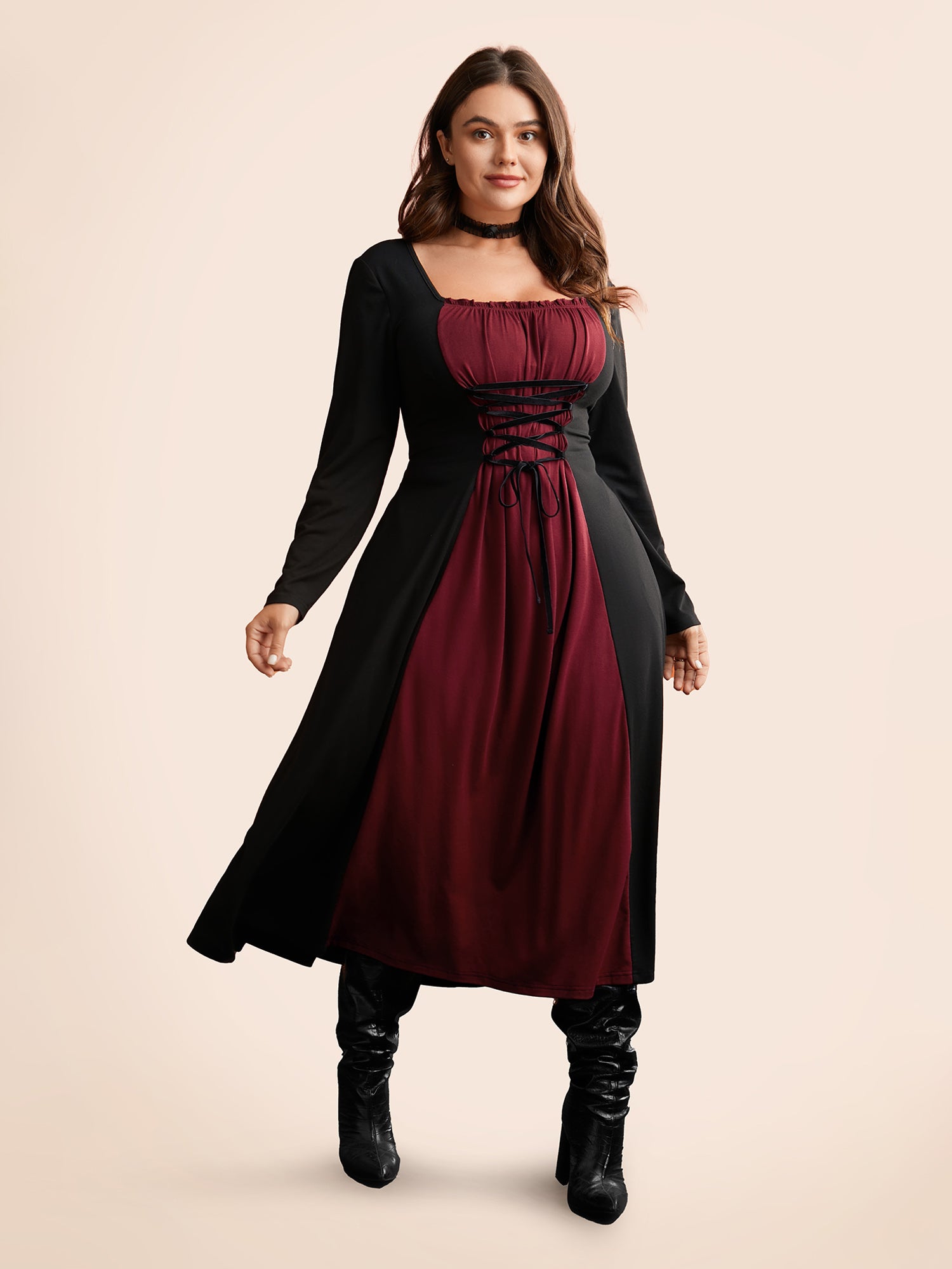 Stretchy Knit Adjustable Tie Frill Trim Midi Dress