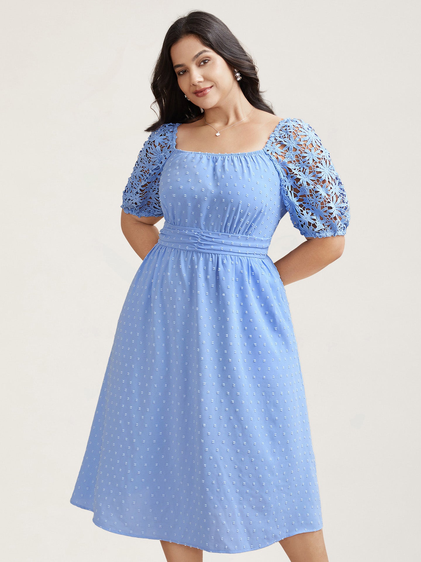 Textured Lace Sleeve Stretchy Waist Midi Dress