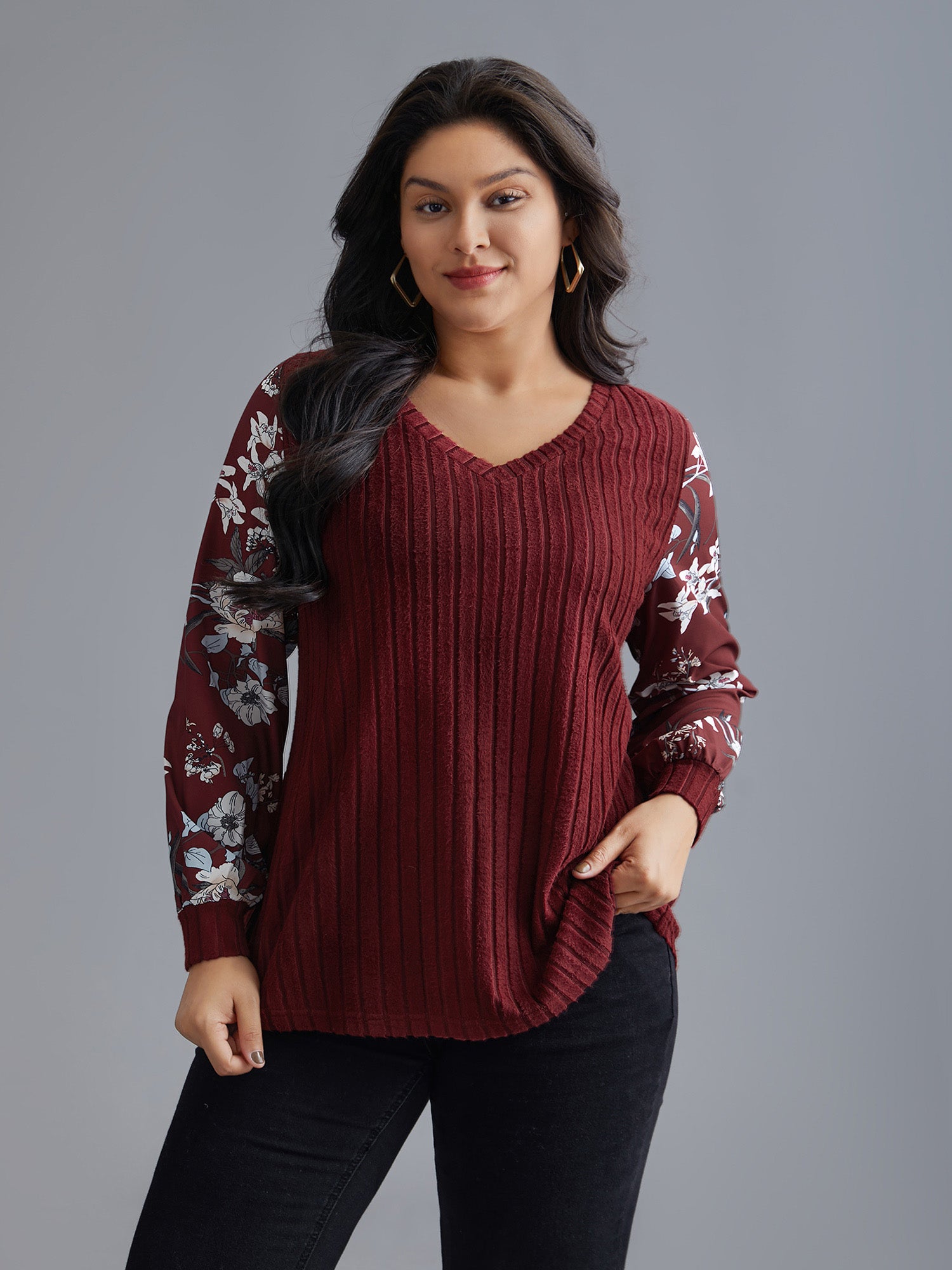 V Neck Floral Patchwork Pit Strip T-shirt