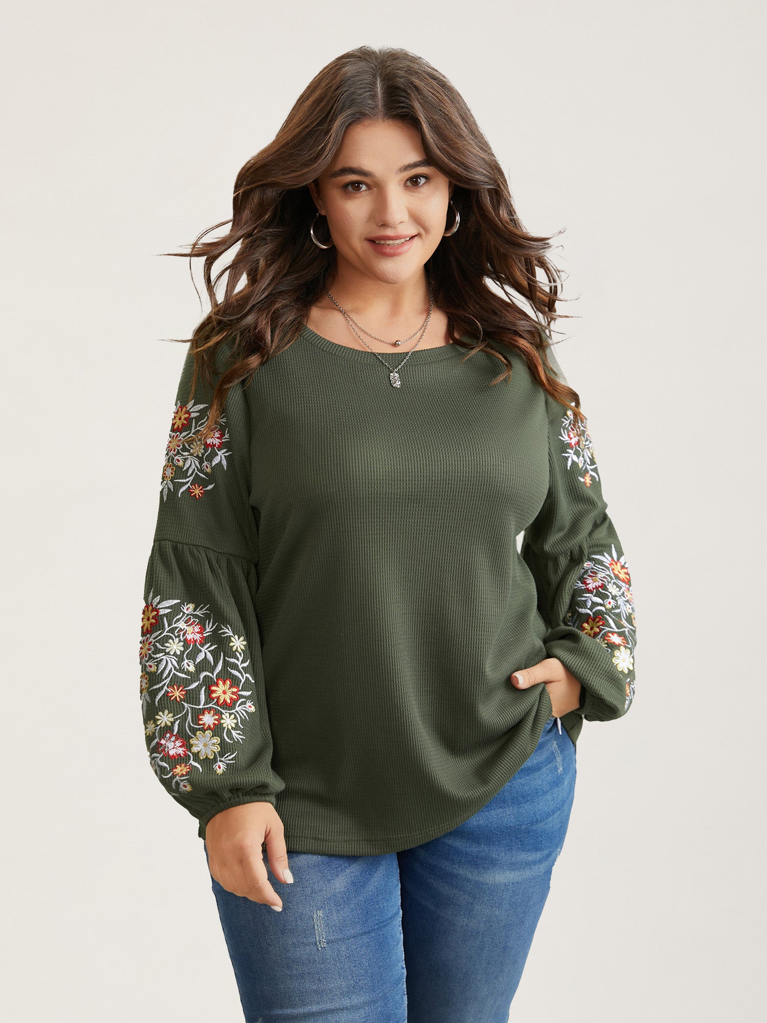 Waffle Knit Floral Embroidered Lantern Sleeve T-shirt