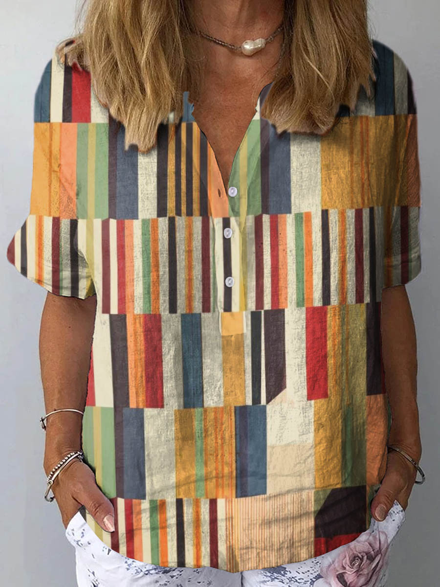 Women's Abstract Geometric Pattern Art Print Casual Cotton And Linen Shirt