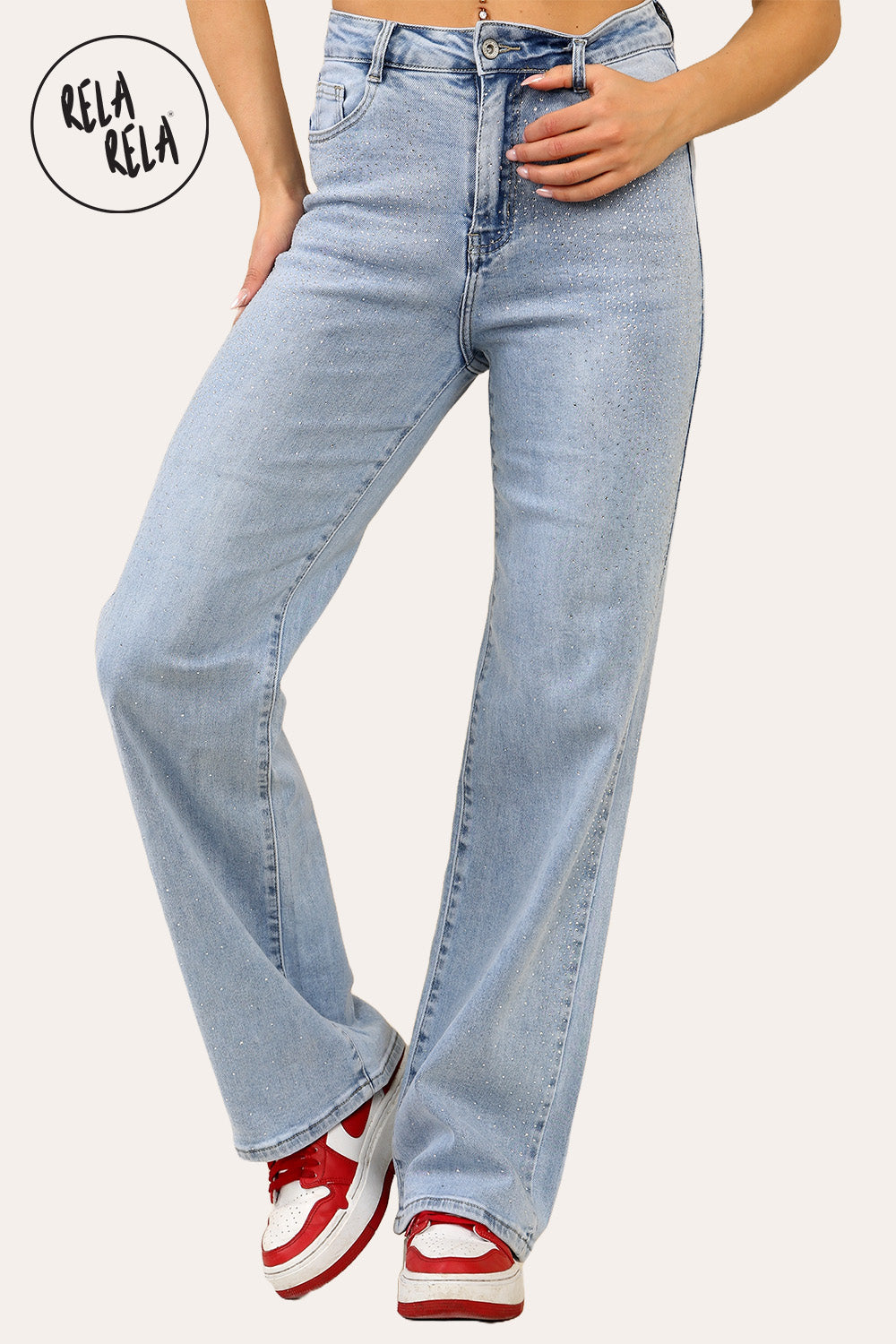 Women's Blue Viral Stretchy Mid-Waist Rhinestone Detailed Wide Leg Jeans in Light Blue