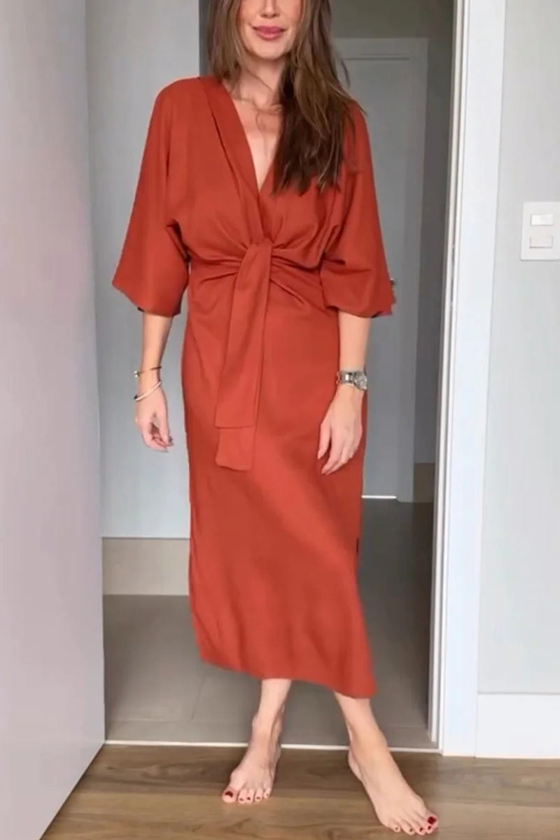 Women's Casual V-neck Cotton and Linen Lace-up Dress