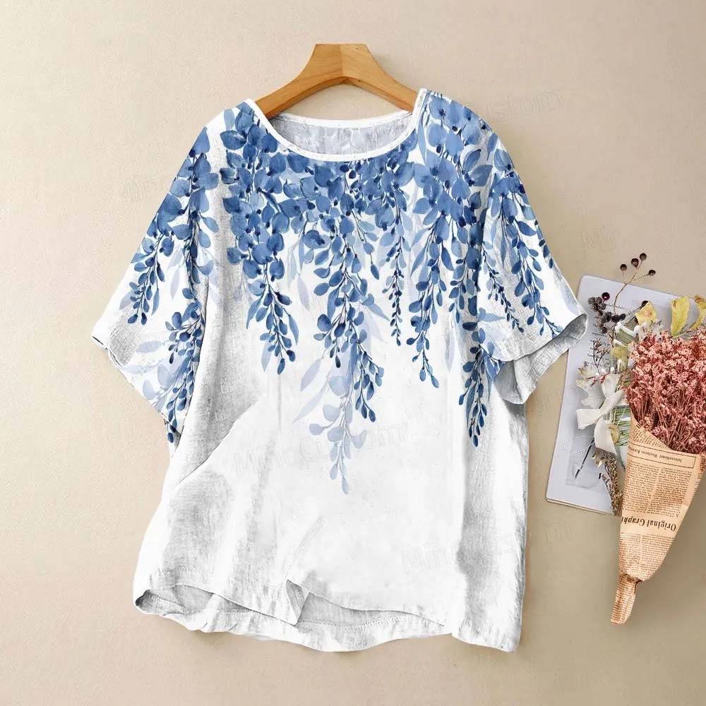 Women's round neck blue leaf print short sleeve top