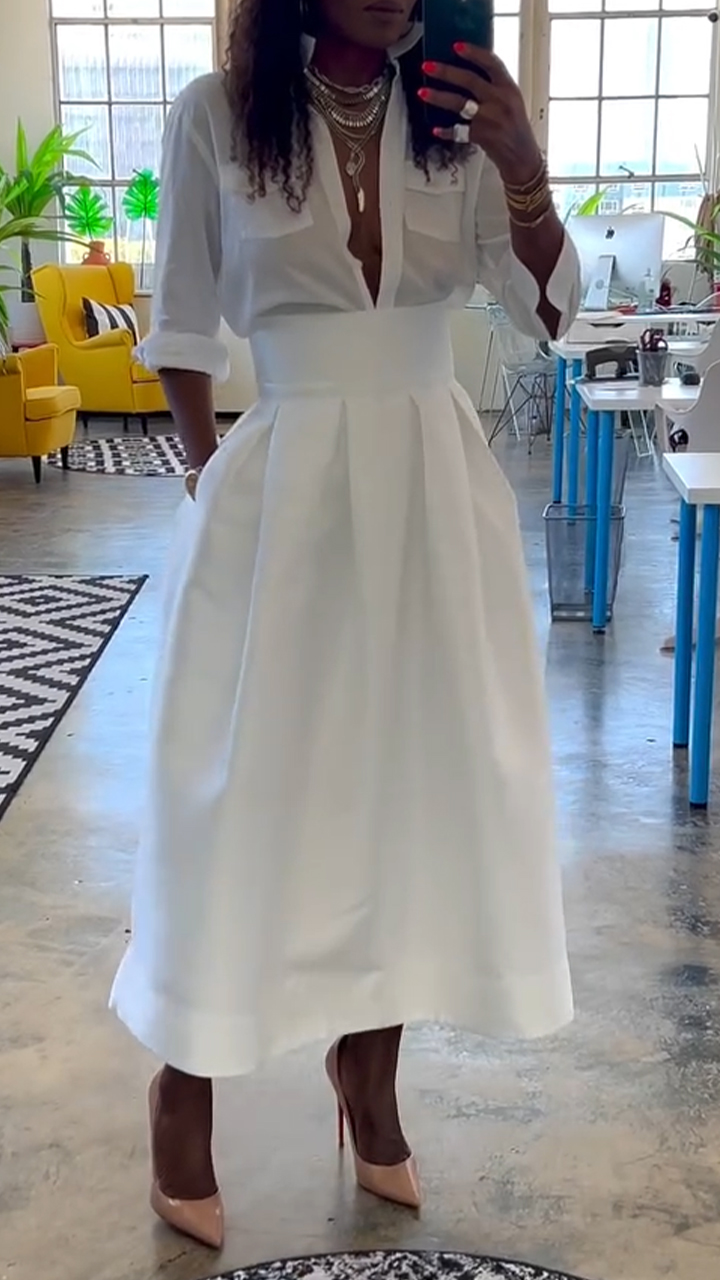 Women's Lapel Double Pocket Top + A-line Skirt Casual Suit