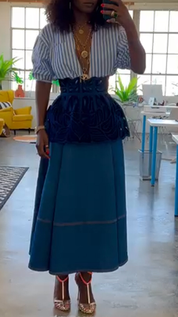 Women's Lapel Striped Shirt + Denim Skirt + Hollow Waist Casual Suit