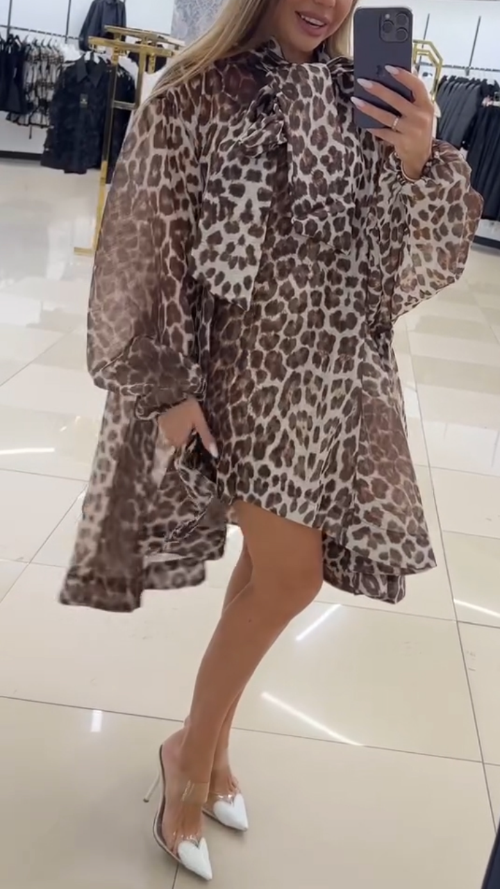Women's Leopard Print Tie Casual Chiffon Swing Dress