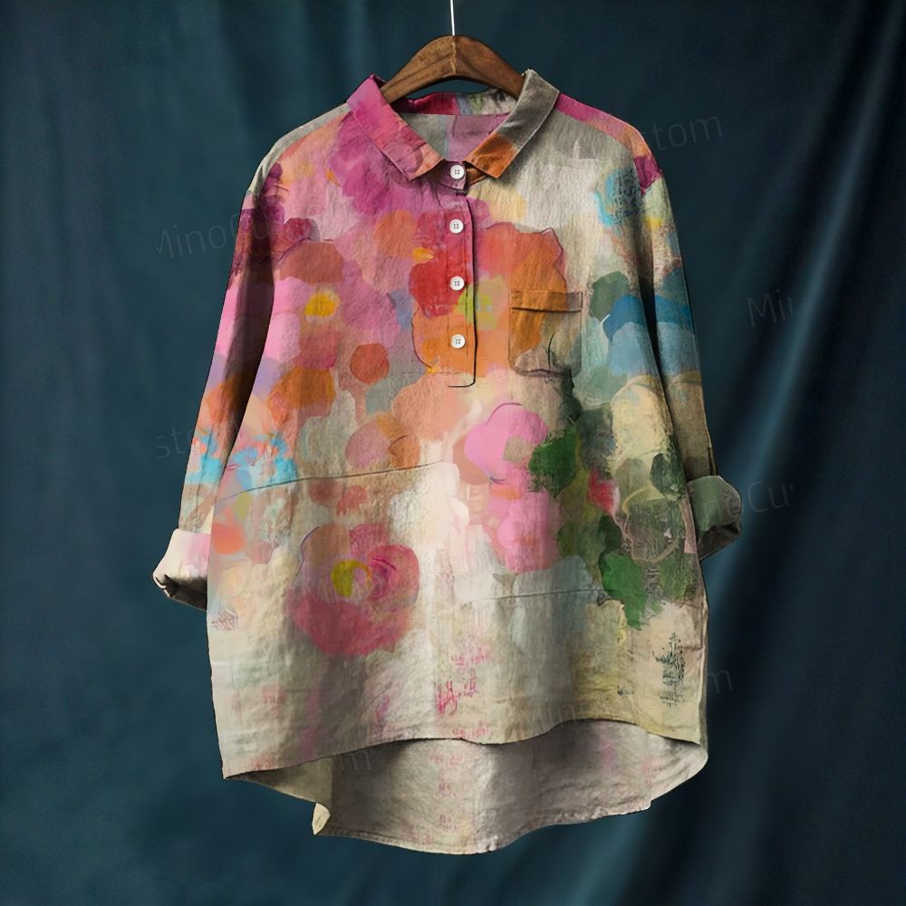 Vintage women's colorful cotton and linen shirt with floral pattern long sleeve shirt