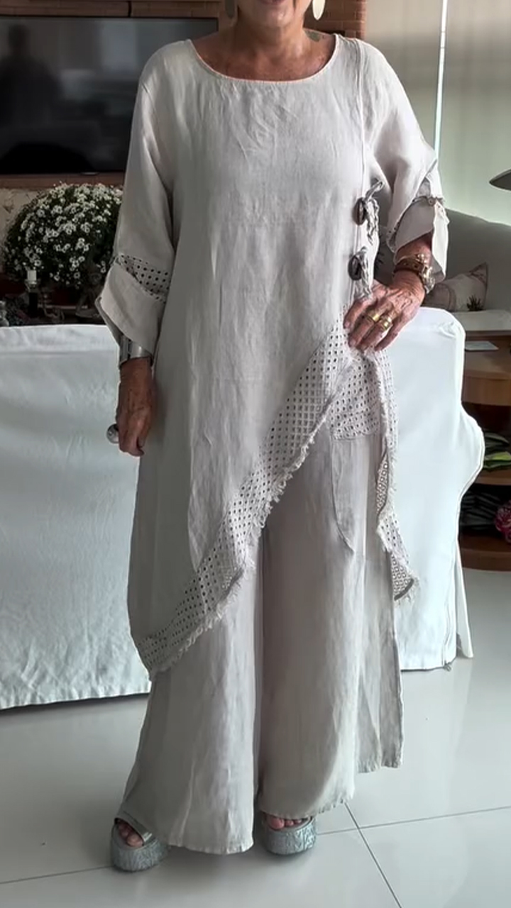 Women's Round Neck Irregular Hollow Top+loose Casual Pants Set
