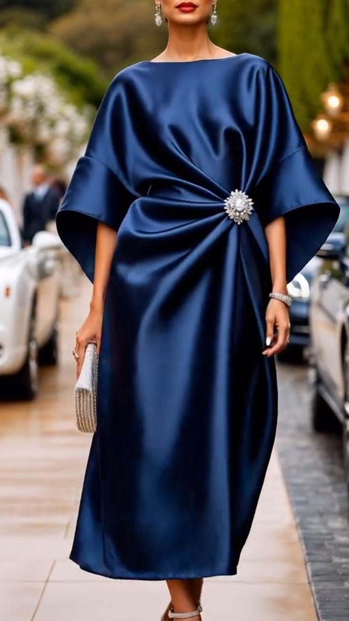Women's Round Neck Satin Pleated Elegant Dress