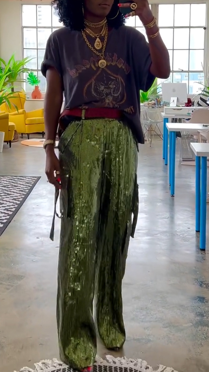 Women's Round Neck T-shirt + Sequined Multi-pocket Trousers Set