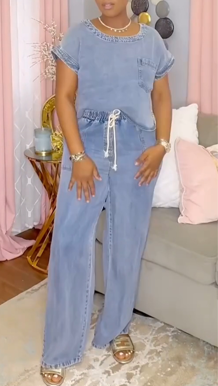 Women's Round Neck Top + Tie-strap Trousers Tencel Denim Casual Suit