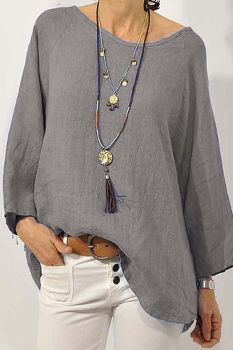 Women's solid color cotton and linen round neck nine-quarter sleeve top