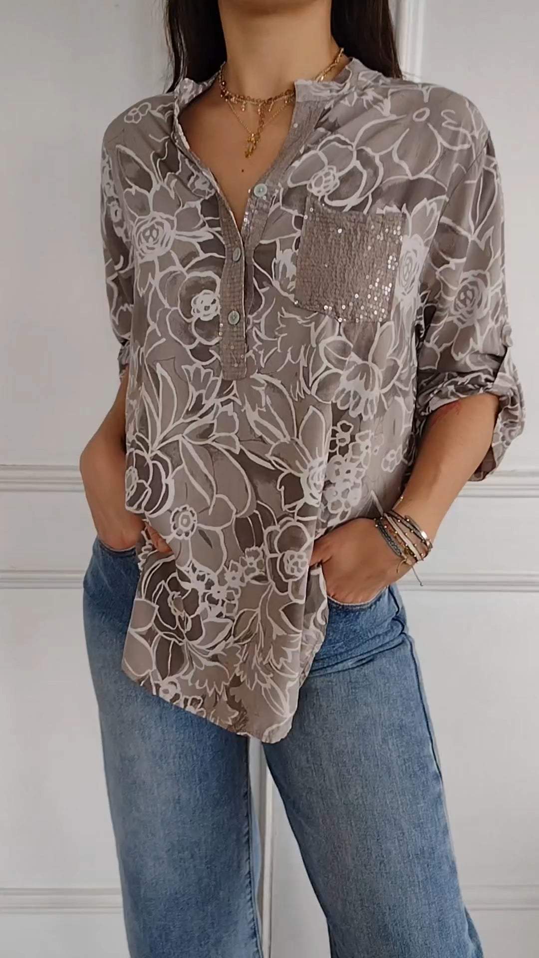 Women's V-neck Mid-sleeve Printed Sequined Casual Top