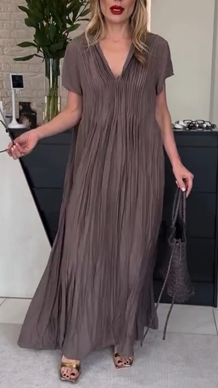 Women's V-neck Pleated Patchwork Loose Casual Dress