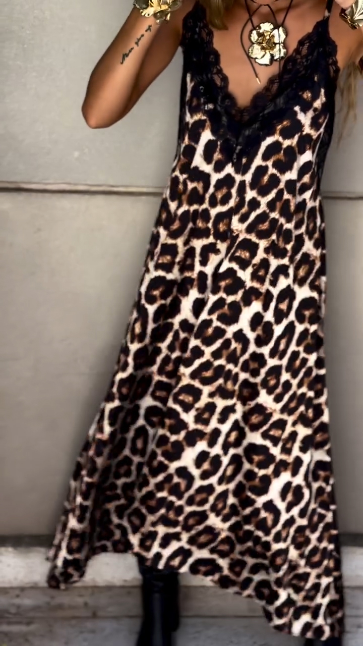 Women's V-neck Sleeveless Leopard Lace Stitching Casual Dress