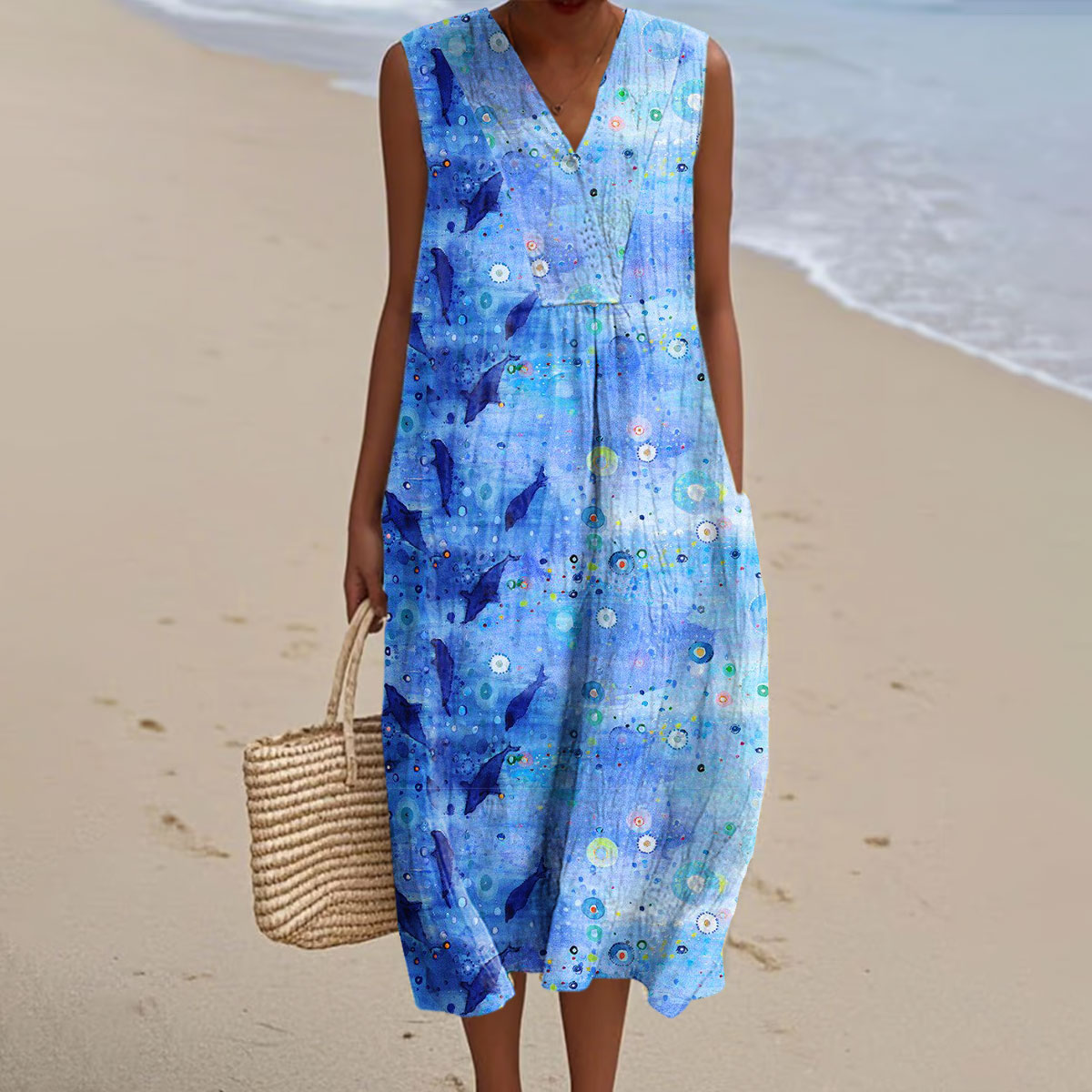 Women's Vintage Blue Ocean Art Print Sleeveless Cotton Pocket Wrap V Neck Dress