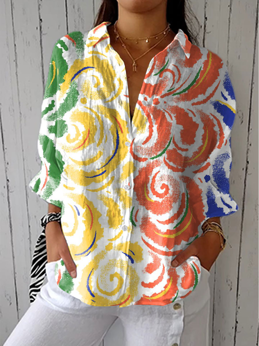 Women's Vintage Color Block Art Print Casual Linen V-neck Shirt