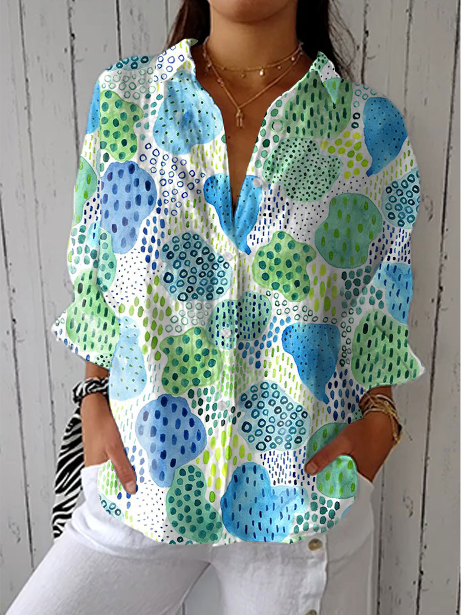 Women's Vintage Color Block Dot Art Print Casual Linen V-neck Shirt
