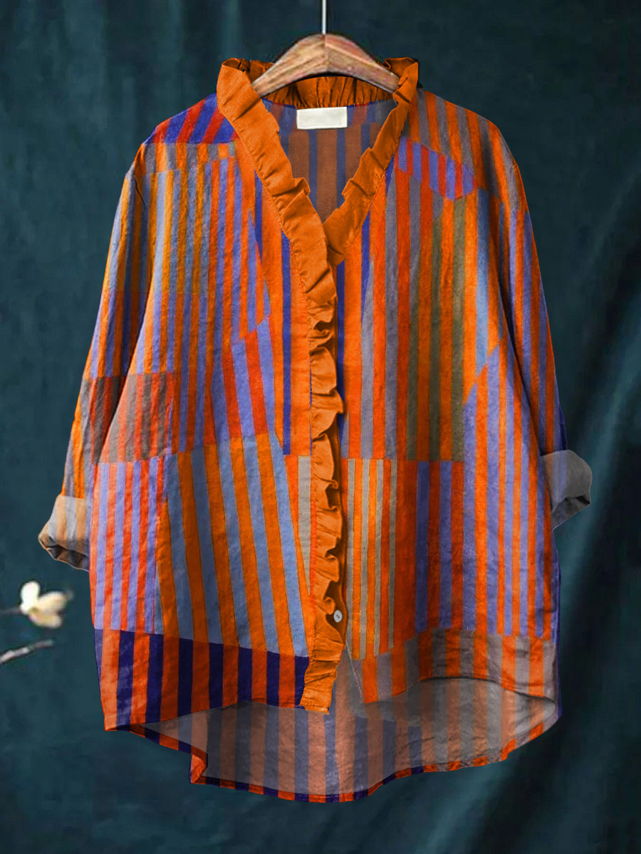 Women's Vintage Colorblock Striped Art Print Casual Cotton And Linen Ruffle Shirt