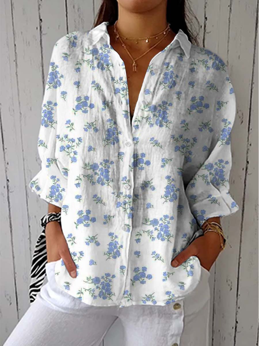Women's Vintage Floral Art Print Casual Cotton Linen V-neck Shirt