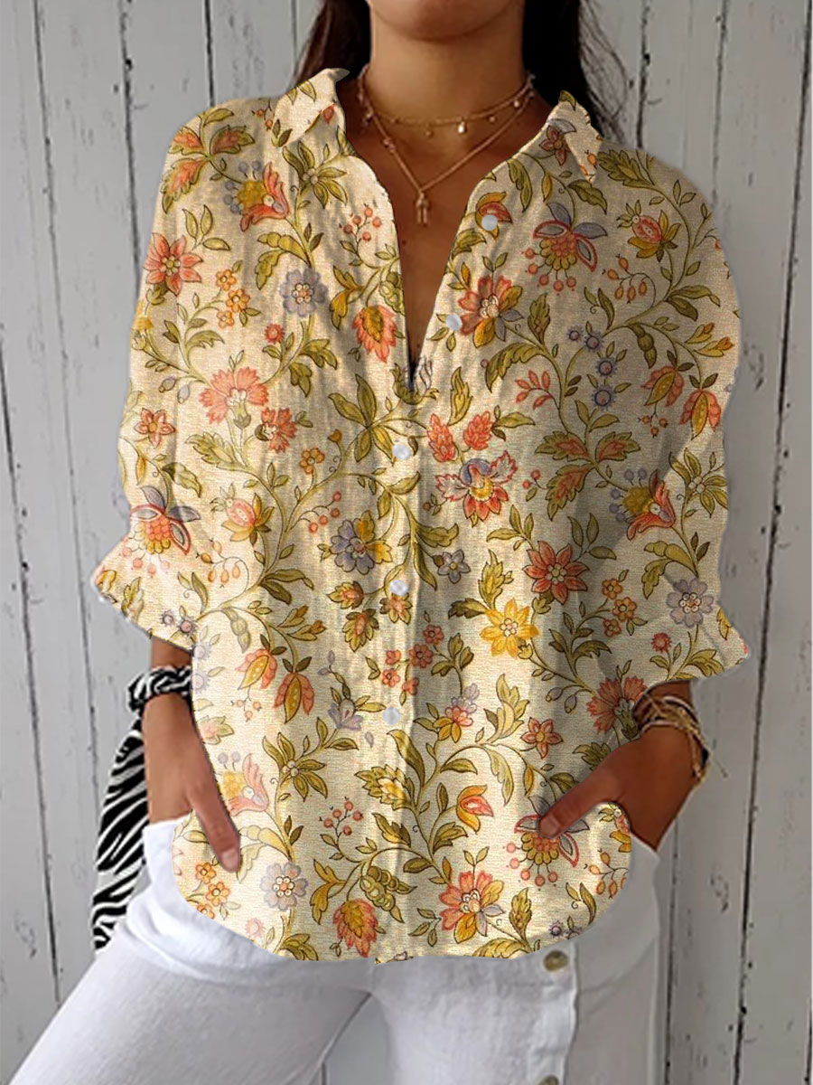 Women's Vintage Floral Art Print Casual Linen V-neck Shirt