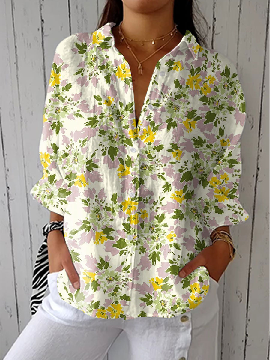 Women's Vintage Floral Art Print Casual Linen V-neck Shirt