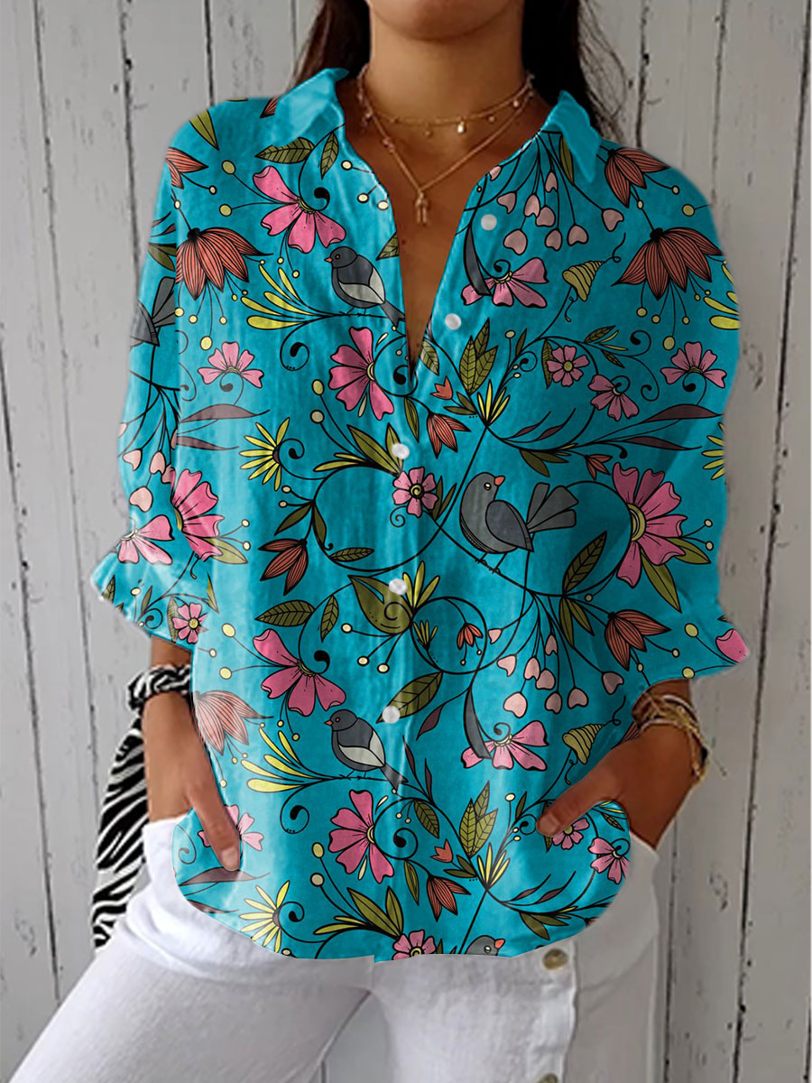Women's Vintage Floral Art Print Casual Linen V-neck Shirt-3/4 Sleeve Shirt