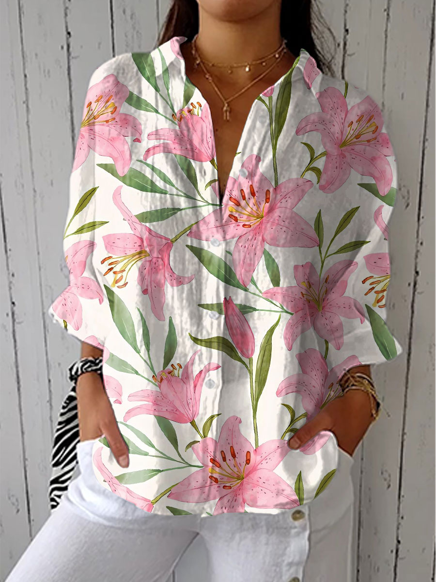 Women's Vintage Floral Art Print Casual Linen V-neck Shirt