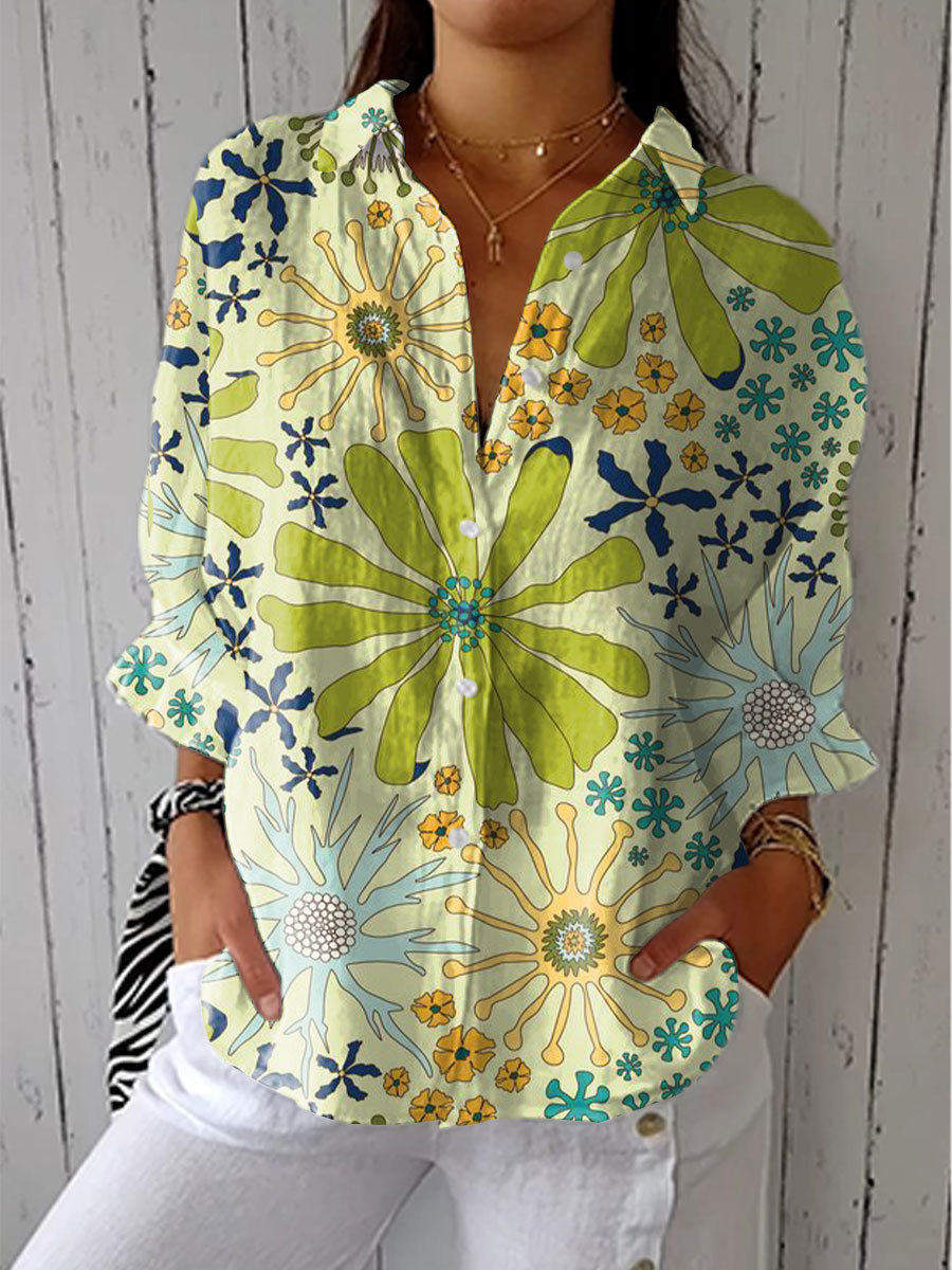 Women's Vintage Floral Art Print Casual Linen V-neck Shirt